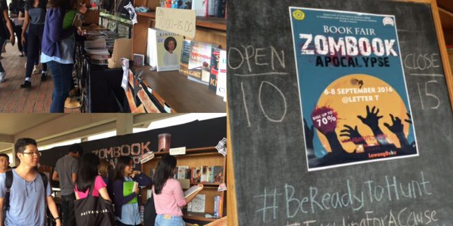 Bookfair merupakan salah satu program tahunan Divisi Penelitian dan Pengembangan (Litbang) Himpunan Mahasiswa Program Studi Ilmu Hubungan Internasional (HMPSIHI). Kegiatan ini dimaksudkan untuk menambah ketertarikan dan minat baca setiap mahasiswa di Program Studi Ilmu Hubungan Internasional UNPAR. Bookfair tahun ini diadakan pada 6-8  September 2016 di Taman FISIP dan mengambil tema “Zoombook Apocalypse“. Tema unik ini diambil dengan tujuan menggambarkan para mahasiswa yang datang mengunjungi bookfair sebagai zombie yang tertarik pada buku-buku yang digambarkan manusia. Selain itu, diharapkan dengan tema yang unik ini, ketertarikan mahasiswa untuk mengunjungi bookfair pun semakin meningkat. Bekerjasama dengan Periplus, Reading Lights, dan Lawang Buku, panitia Bookfair pun menawarkan potongan harga hingga 70%.